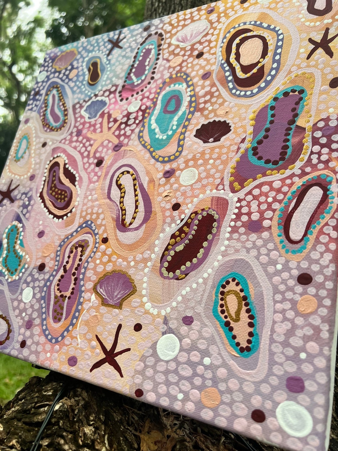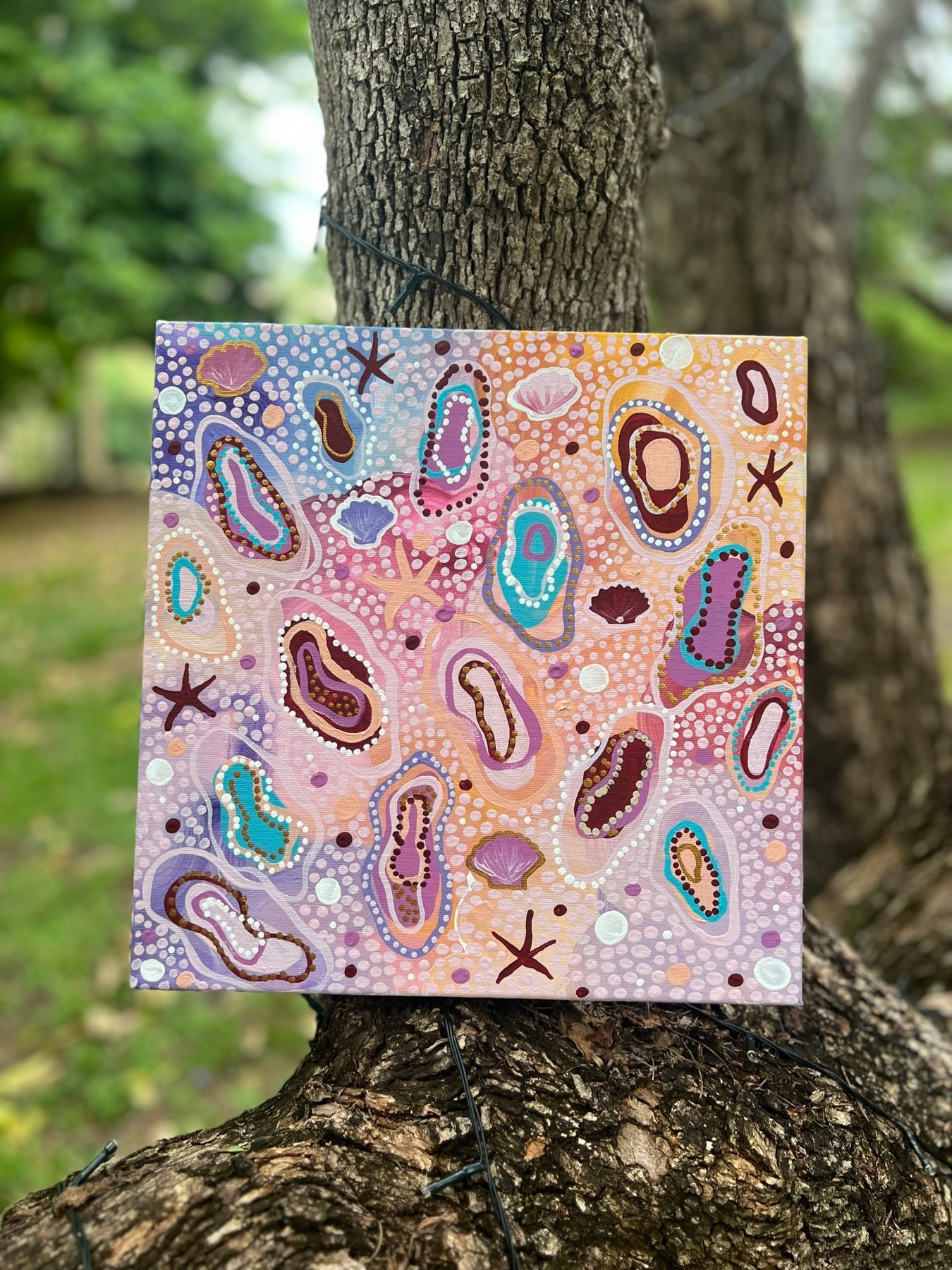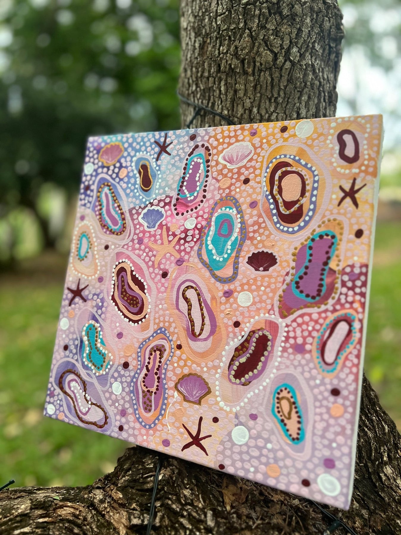 This artwork reflects my connection to the sea and memories of growing up gathering oysters along the shoreline. The shells and oysters symbolise moments of care, sharing and togetherness, where food, family and ocean come together.